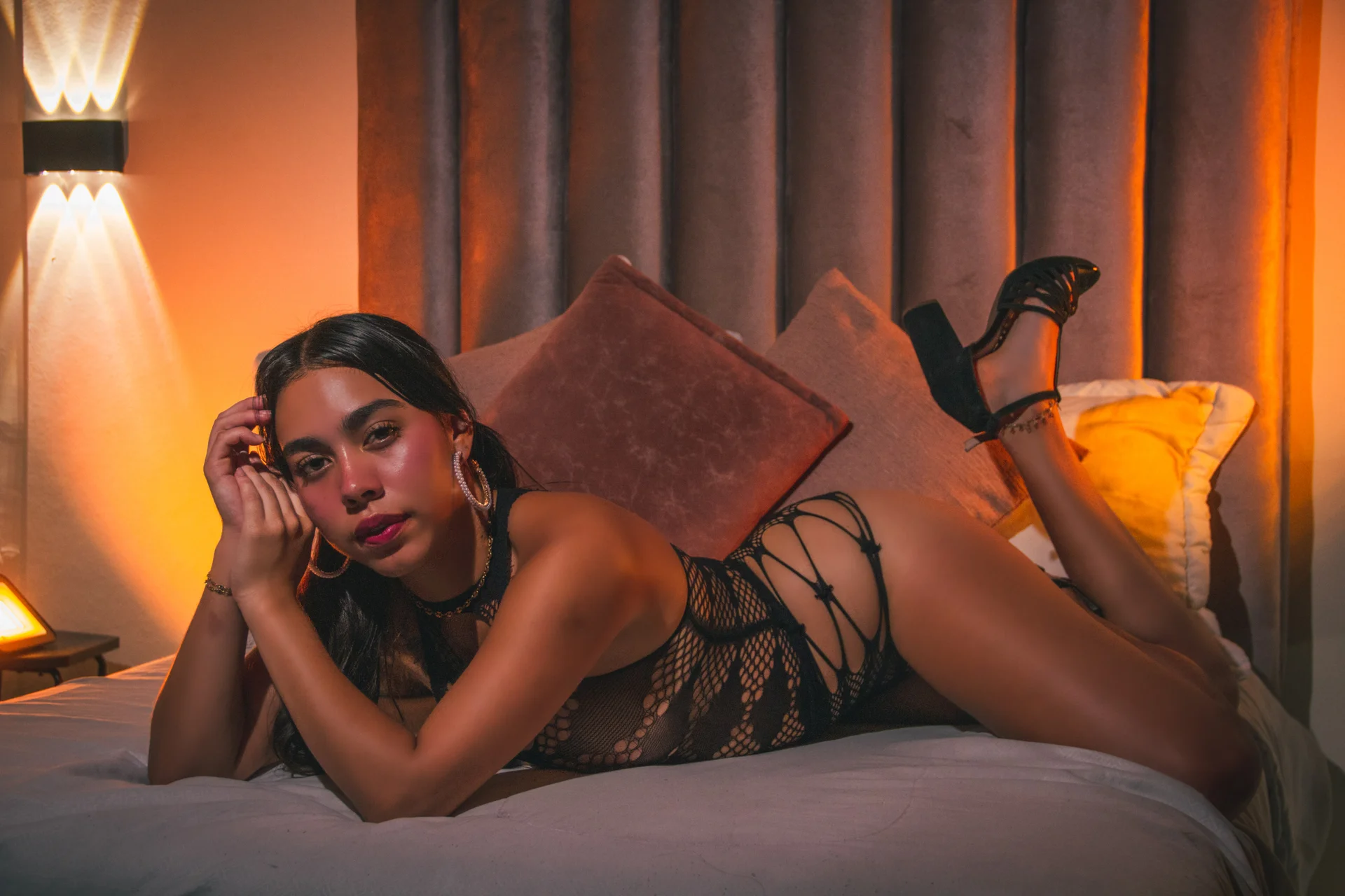 with eyes that seem to invite the viewer to enter their personal space. Her lips, highlighted in a carmine tone, add a focal point of intense femininity.